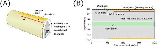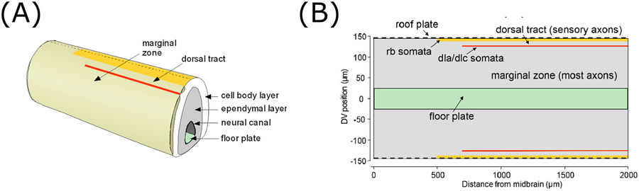 Figure 1. Overview of the tadpole spinal cord anatomy and the modelâs 2D representation. (A) Diagram of a section of the tadpole CNS showing the main regions, including the neural canal surrounded by ependymal progenitor cells and the ventral floor plate, surrounded in turn by a layer of neuronal cell bodies. Lying outside the cell body layer is the marginal zone, in which most axons grow, and the dorsal tract which contains RB axons and is separated from the marginal zone by a column of sensory interneuron cell bodies (red line). Dorsally the marginal zone is bounded by a column of sensory RB neuron cell bodies (yellow line). (B) The CNS opened like a book along dorsal midline (dashed line in A) to show the two-dimensional modelling area.