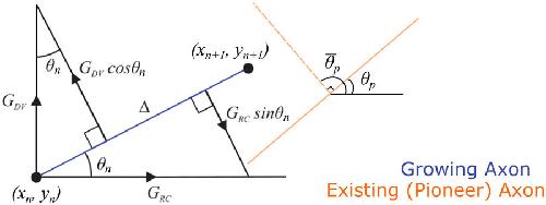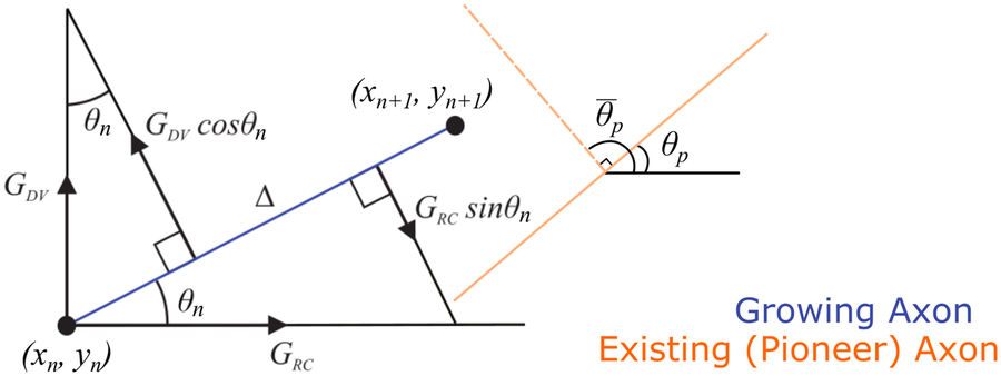 Figure 2. Schematic representation of the fasciculation/repulsion mechanism in the model. The solid orange line shows the direction of growth for the closest pioneer axon. This orange line is used to adjust the current growth angle of the follower axon shown by blue solid line. In case of fasciculation the current growth angle becomes closer to the growth angle of the pioneer axon. In case of repulsion the perpendicular dashed orange line is used to adjust the axon growth angle of the follower axon. |
