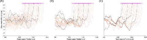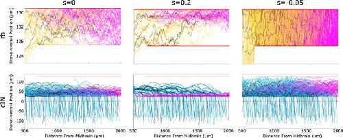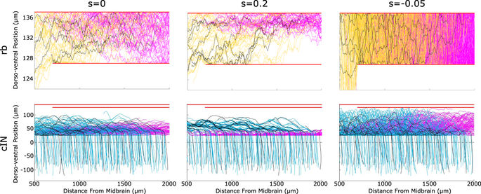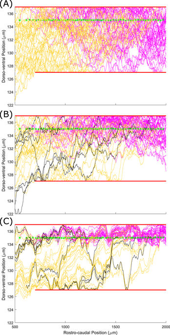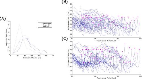 Figure 9. The effect of fasciculation on aIN axon trajectories. (A) Histogram comparing the dorso-ventral distribution of axons in the anatomical data used for optimization (solid line), optimized model output without fasciculation (dashed line) and model output with fasciculation sensitivity 0.1 (dotted line). (B,C) Example generated primary aIN axons for the s = 0 and s = 0.1 cases respectively. Magenta stars show positions where the axons begin growing. |
