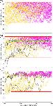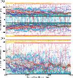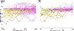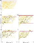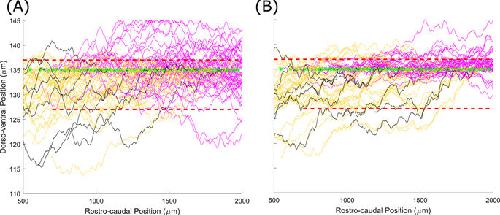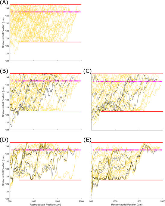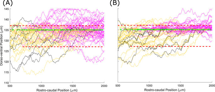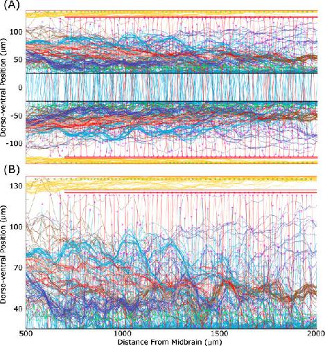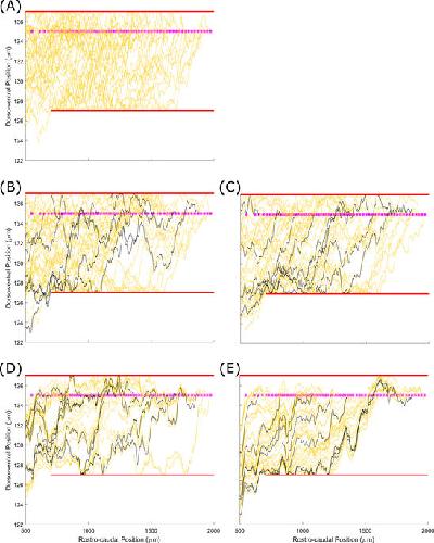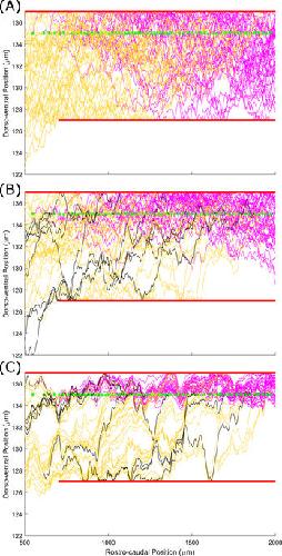 Figure 8. Fasciculation helps to constrain sensory axons to the dorsal tract when normal growth barriers do not perfectly block axon growth. Barriers (red lines) have 25 µm gaps at 25 µm intervals. Yellow lines show primary axons, magenta lines show secondary, black lines are pioneer primary axons. (A) With no fasciculation 24% of axon points are outside the marginal zone. (B) With fasciculation (s=0.2,r=1) 15% of axon points are outside the marginal zone. |