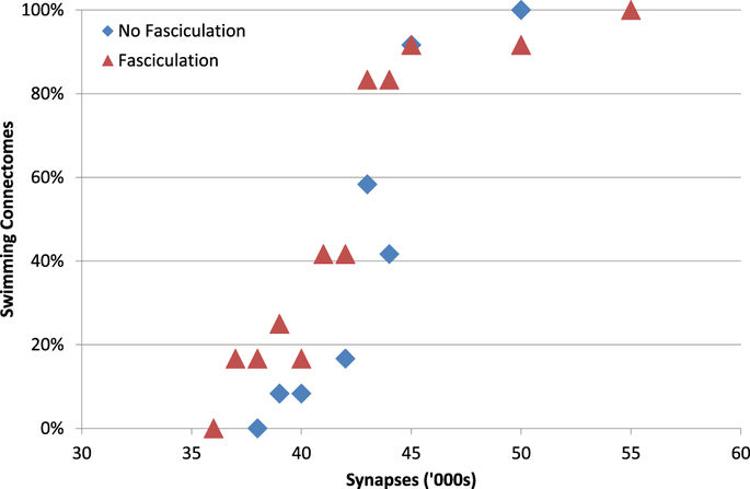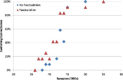 Figure 10. Reducing the number of synapses reduces the proportion of connectomes that can generate stable alternating patterns of MN spikes (swimming). A set of 24 connectomes (12 with fasciculation, 12 without) were modified to simulate the effect of reducing the synapse formation probability. Decreasing the probability (and therefore number of synapses) decreases the proportion of the 12 connectomes that can swim (s=0.2,r=1)
