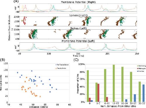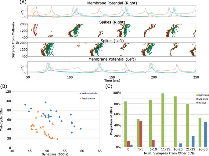 have fewer mid-cycle dINs. (C) A dIN’s spiking pattern depends on how many synapses it receives from other dINs. Neurons that receive little excitation (but not none) have a roughly 50% chance of firing mid-cycle spikes. Inactive dINs tend to receive a lot of excitatory input, but are unable to spike due to depolarisation blockade. Data from four connectomes with fasciculation and probability reduced to give approximately 50,000 synapses. |