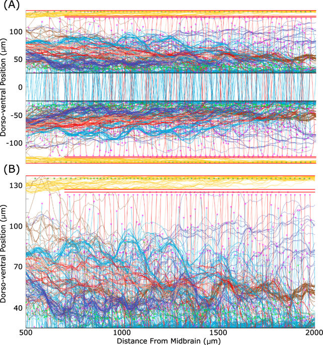 , colour coded as in Table 1. (B) Zoom showing only axons on the left side of the body. Magenta and green stars show the initial point of the primary and secondary axon respectively. Note that the horizontal scale is the same in both figures. |