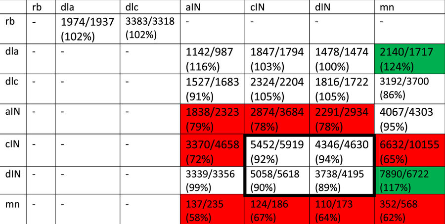 Table 2: Number of synaptic connections (rounded average across 12 connectomes for each case) between different cell types on both sides, with and without fasciculation (first and second numbers respectively), as well as the percent change in synapse count that results from fasciculation. Each row gives the number of connections made by neurons of a particular type (first column) onto neurons of every other type. Dashes indicate pairs where there is a negligible number of connections (<50) in both cases. Green and red highlights show pairs with particularly large increases and decreases (respectively) in synapse counts. The core CPG network (dINs and cINs) is highlighted with a bold border. |
