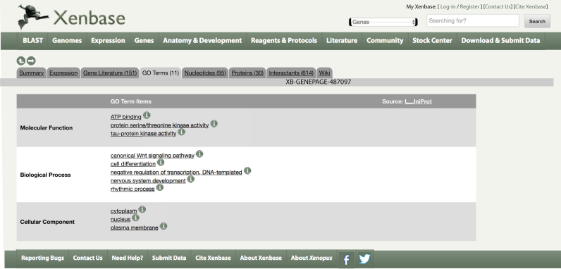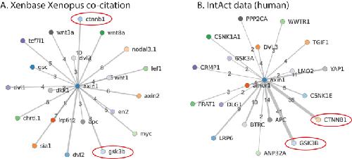 Figure 3. Comparison of Xenopus literature gene co-citation to human protein interaction data from IntAct. A. Genes co-cited with axin1 in Xenbase. Two key interactants, ctnnb1 (beta-catenin, 10 co-citations) and gsk3b (glycogen synthase kinase 3 beta, 8 co-citations) are circled in red. B. IntAct data on human proteins interacting with AXIN1. CTNNB1 has 35 results and GSK3B has 41 results, ranging from co-immunoprecipitation and yeast two-hybrid interactions, to fluorescence polarization spectroscopy and protein kinase assays (click on interactions hyperlink on Xenbase to view evidence).