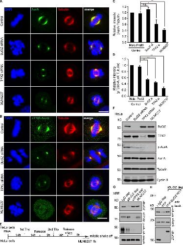 Figure 1. Effects of BuGZ on AurA kinase activity in mitosis. (A–D) Cells were transfected with control, BuGZ, or TPX2 siRNA (si) or were treated with AurA inhibitor MLN8237 (100 nM) followed by staining with antibodies to total AurA (A) or p-AurA (B). Bars, 10 µm. The immunostaining intensity of total AurA (C) and p-AurA (D) in control siRNA–treated cells in metaphase or prometaphase (ProM, containing misaligned chromosomes or thick chromosome bars) and cells in the experimental groups containing misaligned chromosomes were quantified. 75–152 total cells from three independent experiments in each experiment were measured and quantified. Error bars indicate SEM. One-way ANOVA: *, P < 0.05; ***, P < 0.001. (E) Scheme of cell synchronization and mitotic shakeoff. (F) Cells transfected with siRNA were synchronized, collected, and analyzed by Western blotting with indicated antibodies. (G) XEEs were depleted (dep) with unimmunized rabbit IgG (IgG), xBuGZ, or xTPX2 antibodies or were treated with MLN8237. xAurA was immunoprecipitated and analyzed by Western blotting using indicated antibodies. (H) XEEs were depleted of xBuGZ and supplemented by purified YFP or YFP-xBuGZ followed by AurA immunoprecipitation and Western blotting. Noc, nocodazole; Thy, thymidine.