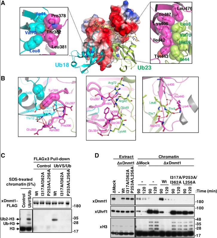 The proper location and timing of Dnmt1 activation are essential for DNA methylation maintenance. We demonstrate here that Dnmt1 utilizes two-mono-ubiquitylated histone H3 as a unique ubiquitin mark for its recruitment to and activation at DNA methylation sites. The crystal structure of the replication foci targeting sequence (RFTS) of Dnmt1 in complex with H3-K18Ub/23Ub reveals striking differences to the known ubiquitin-recognition structures. The two ubiquitins are simultaneously bound to the RFTS with a combination of canonical hydrophobic and atypical hydrophilic interactions. The C-lobe of RFTS, together with the K23Ub surface, also recognizes the N-terminal tail of H3. The binding of H3-K18Ub/23Ub results in spatial rearrangement of two lobes in the RFTS, suggesting the opening of its active site. Actually, incubation of Dnmt1 with H3-K18Ub/23Ub increases its catalytic activity in vitro. Our results therefore shed light on the essential role of a unique ubiquitin-binding module in DNA methylation maintenance.