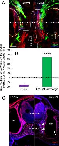 Figure 4. Rostral expansion of hypaxial muscle fibers following Vismodegib treatment. A, The distance from the ear midline from the rostral boundary of the somites was calculated from animals immunostained with antibodies against tubulin (green), MyoVI (red) and counterstained with Hoechsts to label neurons, hair cells and muscletissue, and nuclei, respectively. A line was drawn through the midline of the ear (dotted line), calculated from the anteroposterior diameter of the ear. From that line, the distance to the rostral boundary of the somites was determined (T-shaped line). Positive values were assigned for distances rostral to the midline and negative values for distances caudal to the midline. B, Means plus or minus standard errors of the mean for both controls and animals treated with 6.25 µM Vismodegib calculated using the method from (A). ****pâ<â0.0001 C, Coronal section showing that hypaxial muscle fibers (outlined and arrows) expanded between the brain and the ear in animals treated with 6.25 µM Vismodegib. Scale bars represent 100 μm. [Color figure can be viewed at wileyonlinelibrary.com]