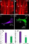 Figure 5. Effect of Vismodegib treatment on Mauthner Cell Development. A, 3A10 antibody labeling of a pair of Mauthner cells from a control Xenopus. B, 3A10 antibody labeling of a pair of Mauthner cells from an animal treated with 6.25 µM Vismodegib. Arrowheads for A and B indicate axon crossing at the midline. C, 3D reconstruction of a control Mauthner cell from dextran amine labeling. D, 3D reconstruction of a Mauthner cell from an animal treated with 6.25 µM Vismodegib. E, Shh inhibition results in a significant reduction in the degree of branching of the Mauthner cell in 6.25 µM Vismodegib-treated animals (nâ=â4) compared with control animals (nâ=â4). F, Shh inhibition results in an approximately two-fold reduction in axonal diameter of the Mauthner cell in 6.25 µM Vismodegib-treated animals (nâ=â3) compared with control animals (nâ=â5). Scale bars represent 100 µm.* pâ<â0.05, ****pâ<â0.0001. [Color figure can be viewed at wileyonlinelibrary.com]