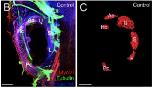 Figure 2.Reduction in ear length along both the anteroposterior and mediolateral axes in Vismodegib treated tadpoles. A, The reduction in ear length along anteroposterior, mediolateral, and dorsoventral axes followed a linear dose response curve. This decrease in ear size was more profound along the anteroposterior dimension of the ear compared with the mediolateral or dorsoventral dimension of the ear. While ears from animals treated with 12.5 µM and greater doses of Vismodegib were significantly reduced in length along the anteroposterior axis from controls, only 18.75 and 21.875 µM Vismodegib-treated animals were significantly reduced along the mediolateral axis from controls. The reduction in length along the anteroposterior axis at the highest dose of Vismodegib was â¼2-fold, whereas along the mediolateral axis, it was only â¼1.3-fold. B, Illustration of lengths measured along the anteroposterior axis and mediolateral axis in the ear of a stage 46 control tadpole. C, Illustration of lengths measured along the anteroposterior axis and mediolateral axis in the ear of a stage 46 tadpole treated with 21.875 µM Vismodegib. Scale bars represent 100 μm. D, The reduction in approximate volume as calculated from the anteroposterior, mediolateral, and dorsoventral lengths from each ear followed a linear dose response curve. The volumes of animals treated with 18.75 µM and 21.875 µM Vismodegib were significantly reduced to â¼1/4th the volume of controls. * pâ<â0.05, ** pâ<â0.01, ***pâ<â0.001, ****pâ<â0.0001 (ANOVA). [Color figure can be viewed at wileyonlinelibrary.com]