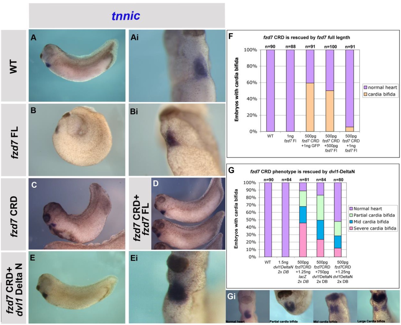 cardia bifida phenotype rescue with fzd7 Full length. (E, Ei). Rescue of fzd7 CRD