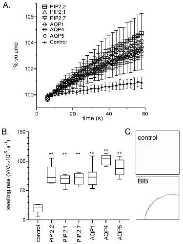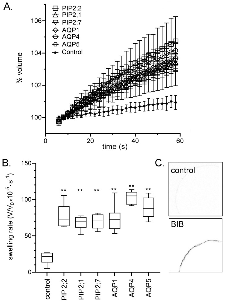 Figure 1. Confirmation of the expression of AQP1, AQP4, AQP5, PIP2;7, PIP2;2, PIP2;1, and BIB channels in Xenopus oocyte membranes. (A) Osmotic swelling responses as a function of time in 50% hypotonic saline for aquaporins (AQP)-expressing oocytes as compared with non-AQP-expressing control oocytes. Data are mean ± SEM; n = 6 per treatment group. (B) Box plots of swelling rates for the data shown in (A). ANOVA and post hoc Bonferroni test; ** (p < 0.01) as compared with control; n = 6 per group. (C) Confocal image of immuno-labeled oocytes confirming BIB protein expression in the oocyte plasma membrane, as described previously [11].