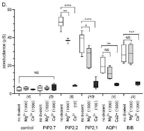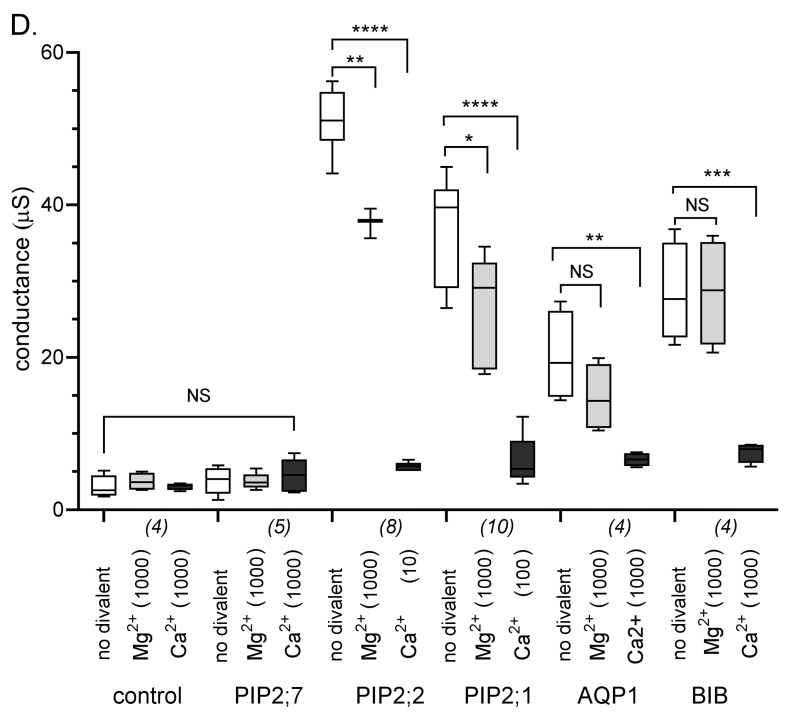 Figure 2. Effects of Mg2+ and Ca2+ divalent cations on ionic current responses in oocytes expressing different classes of AQPs. (A) Superimposed currents as a function of time measured by voltage clamp (steps from −110 to +60 mV, from a holding potential of −40 mV) at maximal activation in divalent-free saline (left), after application of Mg2+ (middle), and after application of Ca2+ (right). Control and PIP2;7-expressing oocytes lacked appreciable conductances. (B) Current-voltage relationships for the traces illustrated in (A). (C) Na+ concentrations in oocytes expressing PIP2;2 as compared with control oocytes after incubation in Frog Ringers containing 96 mM NaCl for three days. Data are from four replicates; each replicate contained five oocytes. (D) Box plot summary of compiled data for the conductances. Free Ca2+ concentrations are given in μM. **** (p < 0.0001); *** (p < 0.001); ** (p < 0.01); * (p < 0.05); NS (not significant); using ANOVA with post-hoc Bonferroni tests. n values are in italics below the x-axis.