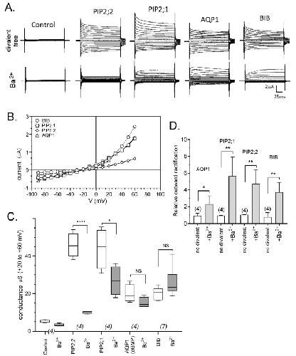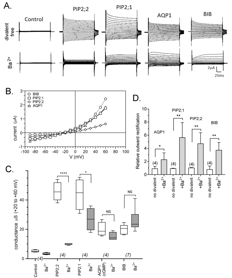 Figure 3. Effects of Ba2+ on ionic currents in oocytes expressing different AQPs. (A) Superimposed current traces as a function of time measured by voltage clamp at maximal activation in divalent-free saline (upper row) and after perfusion with bath saline containing 1 mM BaCl2 (lower). (B) Current-voltage relationships in Ba2+ for traces presented in (A). (C) Box plot summary of compiled data for AQP1, PIP2;1, PIP2;2 and BIB channels before and after 1 mM Ba2+ application. (D) Histogram showing the relative outward rectification values (I+60/I−80) as mean ± SEM. Ratios were calculated as amplitude of outward (+60 mV) to inward (−80 mV) currents. **** (p < 0.0001); ** (p < 0.001); * (p < 0.01); NS (not significant); using ANOVA with post-hoc Bonferroni tests. n values are near the x-axis.
