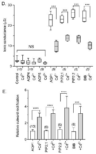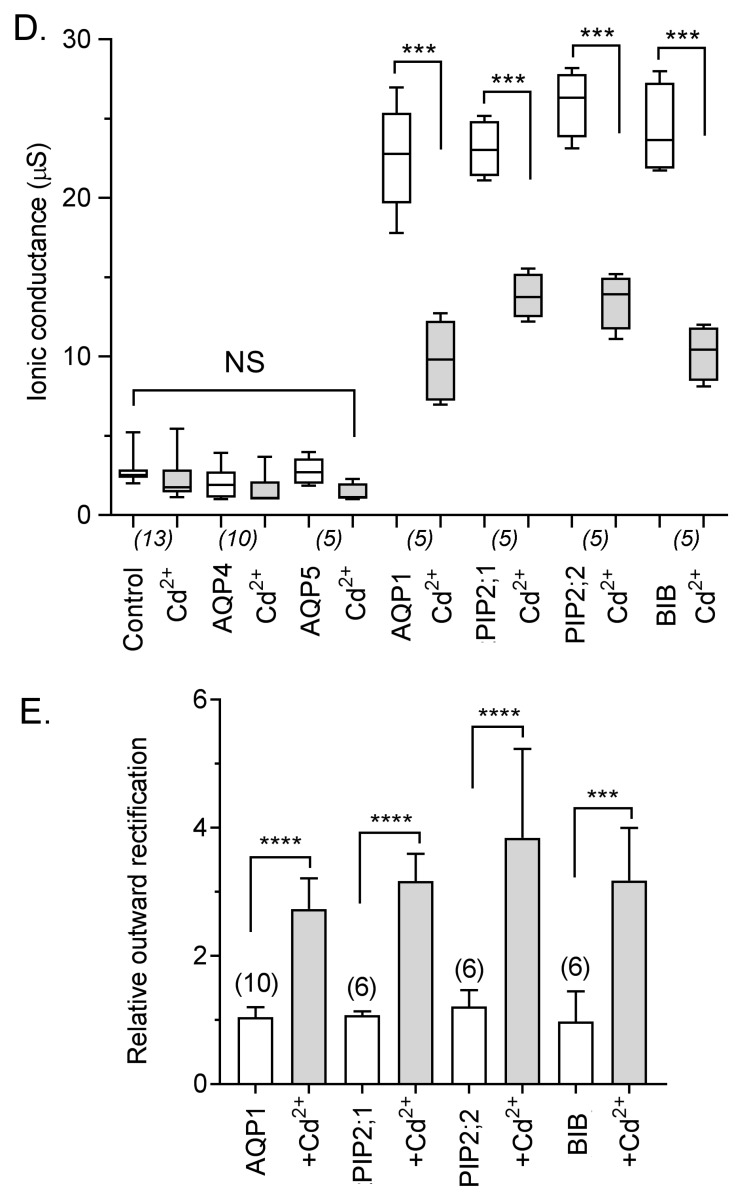 Figure 4. Effects of Cd2+ on ion current responses in oocytes expressing different classes of AQPs. (A) Superimposed current traces under voltage clamp recorded at maximal activation (if present) in divalent-free saline (left) and after perfusion with bath saline containing 1 mM CdCl2 (right). (B) Current-voltage relationships for data presented in (A). (C) Rates of onset of block after perfusion of bath saline containing 1 mM Cd2+, as measured using repeated voltage steps to +40 mV. (D) Box plot summary of compiled data for control, AQP4, AQP5, AQP1, PIP2;1, PIP2;2 and BIB expressing oocytes before and after Cd2+ application. n values are below the x-axis. (E) Histogram showing relative outward rectification values (mean ± SEM), calculated as the ratio of outward to inward currents at +60 and −80 mV (I+60/I-80). **** (p < 0.0001); *** (p < 0.005); NS (not significant); using ANOVA with post-hoc Bonferroni tests; n values are shown above the histogram bars.