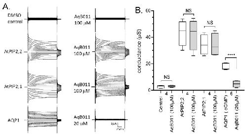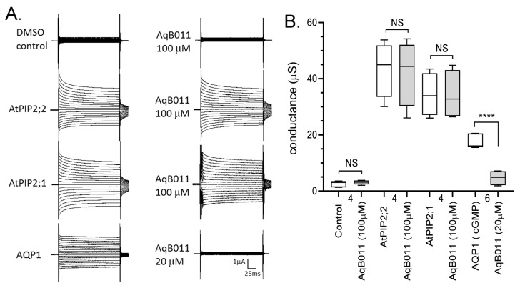 Figure 6. Effects of the arylsulfonamide compound AqB011 on ionic current responses in oocytes expressing different classes of AQPs. (A) Responses were recorded for control (DMSO vehicle), and AtPIP2;1, AtPIP2;2, and HsAQP1 expressing oocytes before (left) and after 2 h incubation (right) in AqB011 at the indicated doses. HsAQP1 was blocked by 20 μM AqB011; AtPIP2;1 and AtPIP2;2 currents were not affected by 100 μM AqB011. (B) Box plot summary of the conductance levels before and after treatment with AqB011. **** (p < 0.0001); NS (not significant); using ANOVA with post hoc Bonferroni tests; n values are below the x-axis.