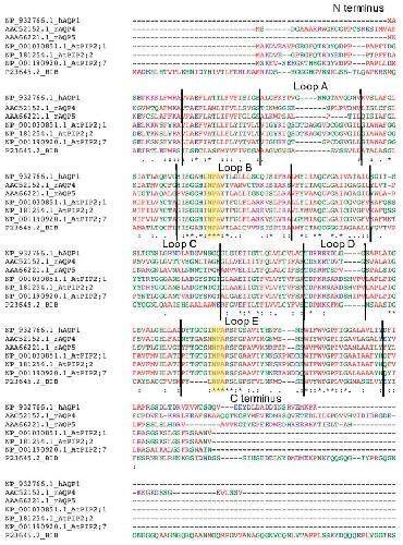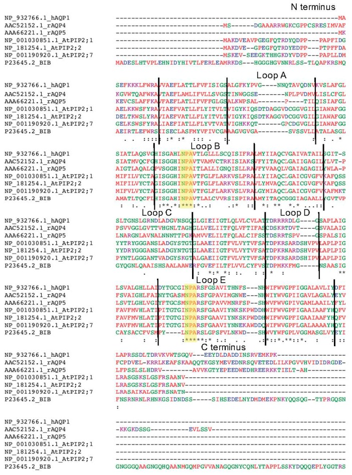 Figure 7. Amino acid sequence alignment of HsAQP1, RnAQP4, RnAQP5, AtPIP2;1, AtPIP2;2, AtPIP2;7 and DmBIB. Sequences from the NCBI Protein Database were aligned using Clustal Omega software (Available online: http://www.ebi.ac.uk/Tools/msa/clustalo/; accessed on 18 October 2017). HsAQP1 protein topology was from the Topology Data Bank of Transmembrane Proteins (TOPDB). Symbols: asterisk (*) identical residues across all sequences; colon (:) highly conserved residue; period (.) semi-conserved residue. Hyphens (-) show gaps; black vertical lines separate predicted domains, as labelled. Colors illustrate chemical properties: positive charged (magenta), negative charged (blue), polar (green), hydrophobic (red). Highlighted in yellow are NPA (Asn-Pro-Ala) signature motifs located in loops B and E, conserved in most aquaporins. The carboxy terminus of DmBIB was truncated for this figure.