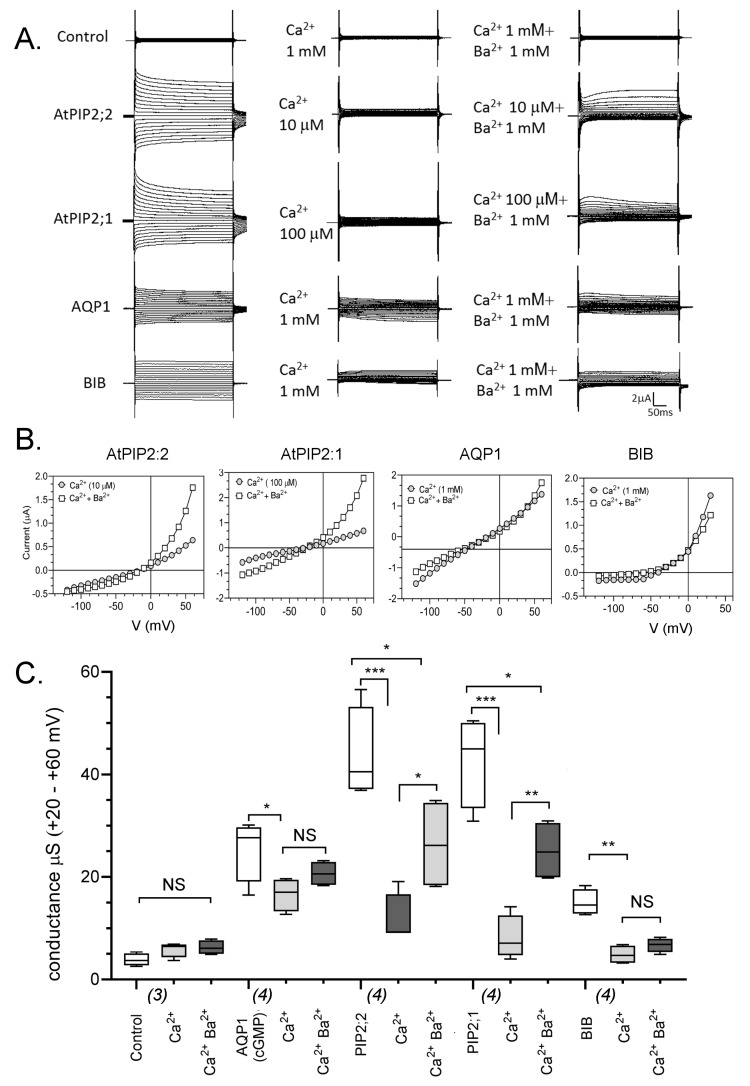 Figure 5. Effects of sequential application of Ca2+ followed by Ba2+ on ionic current responses in oocytes expressing different classes of AQPs. (A) Superimposed current traces under voltage clamp showing the maximal responses of AtPIP2;2, AtPIP2;1, HsAQP1 and DmBIB expressing oocytes recorded in divalent-free saline (left), after perfusion of saline containing the indicated amount of free Ca2+ (middle), and after application of Ba2+ in the continuing presence of the same concentration of Ca2+ (right). (B) Current-voltage relationships for traces shown in (A). (C) Summary box plot of conductance values for AtPIP2;2, AtPIP2;1, HsAQP1 and DmBIB expressing oocytes in different divalent cation salines. *** (p < 0.001); ** (p < 0.01); * (p < 0.05); NS (not significant); using ANOVA with post hoc Bonferroni tests; n values are below the x-axis.