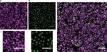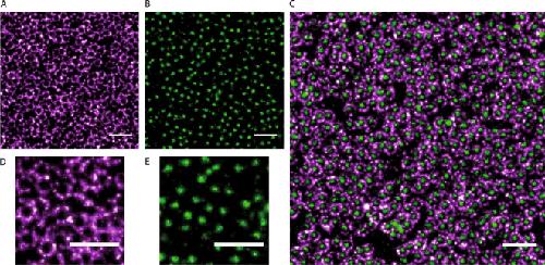 dSTORM imaging of the nuclear envelopes from X. laevis oocytes. (A) dSTORM image of a spread nuclear envelope labelled with anti-gp210 primary antibody and Alexa647 secondary antibody. (B) dSTORM image of a spread nuclear envelope labelled with WGA-Alexa488. Scale bar 500 nm. (C) dSTORM image of a spread nuclear envelope labelled with WGA-Alexa488 (green) and gp210-Alexa647 (magenta). (D) Zoom on the image (A). (E) Zoom on the image (B).