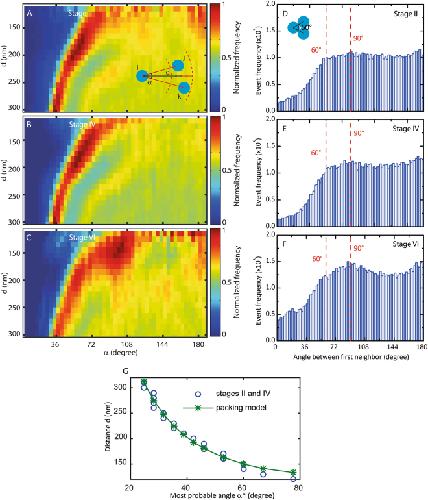 Figure 3. Effect of oocytes development on the organization of the nuclear pore complexes. (A–C) 2D histogram of the probability P(d,α) to observe a NPC on a given envelope with two neighbors at a distance d and forming an angle α respectively for oocytes at stage II, IV and VI. For stage VI oocytes the most probable coordinates are (135 ± 5 nm, 90 ± 6°). The frequency event is normalized by the maximum for each histogram. (D–F) First neighbor angle distribution evolution for respectively stage II, stage IV and stage VI oocytes. The red dashed line at 60° corresponds to the minimal angle possible between 3 NPCs. (G) Experimental most probable angle α* between three nuclear pore complexes as a function of the distance d between the central pore and its two neighbors (dashed line) and theoretical angle α between three nuclear pore complexes as a function of the distance d between the central pore and its two neighbors in the packing model (solid line). In this model all the nuclear pore complexes are in contact with their first neighbors but without any large-scale order.
