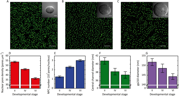 Figure 2. Effect of oocyte development on the density, the number and the diameter of the nuclear pore complexes. (A–C) dSTORM images of nuclear envelopes from oocytes respectively at stage II, IV and VI. The central channel is labelled with fluorescent WGA-Alexa647. Scale bar 5 µm. Insets: Stereomicroscope images of the oocyte respectively at stage II, IV and VI. Scale bar 50 µm. (D) Effect of oocyte development on nuclear pore complex density. (E) Effect of oocyte development on nuclear pore number per nucleus. (F) Effect of oocyte development on central channel diameter. (G) Effect of oocyte development on gp210 diameter. For each condition, the number of investigated NPC is superior to 300 000. Errors are experimental standard errors. The precision of the measurements was assessed by bootstrapping and by comparing different rounds of experiments.