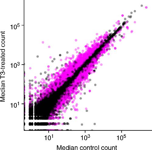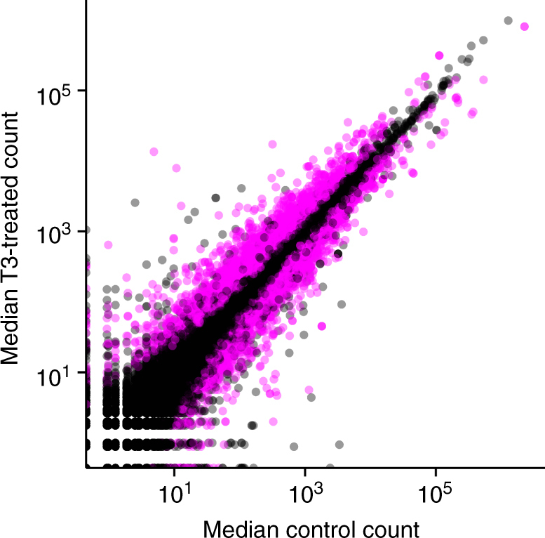 Fig. 1. Median DESeq2-normalized counts of genes detected in the back skin of premetamorphic Rana catesbeiana tadpoles treated with vehicle control or T3 for 48 h. Gene transcripts determined to be significantly differentially expressed (DESeq2 adjusted p-value < 0.05) are indicated in pink, while the remainder are semi-transparent black to convey density. Both predicted protein coding and putative lncRNA genes are depicted