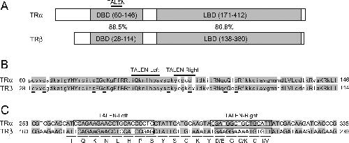 Figure1. Target sites for anti-TRα and anti-TRβ TALENs. (A) Schematic illustrations of X. tropicalis TRα and TRβ proteins. The amino acid identities in the DNA-binding domain (DBD) and the ligand-binding domain (LBD) are shown. A horizontal bar indicates the TALEN target site. (B) Comparison of the amino acid sequences of TRα and TRβ DBDs. The identical amino acids between TRα and TRβ are shaded. Horizontal bars indicate TALEN target sites. Zinc-binding amino acids are underlined. The DNA-binding amino acids are represented by a capital letter. (C) Comparison of nucleotide sequences of TALEN target sites in TRα and TRβ genes. Identical nucleotides between TRα and TRβ are shaded. Boxes indicate TALEN target sites. The bars below the nucleotide sequence show the frame of amino acid sequences. The amino acid sequences are indicated at the bottom.