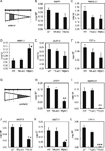 Figure 6. mRNA expression of genes encoding ECM-degrading enzymes in wild-type and TR-knockout tadpole tails during climax of metamorphosis. (A and G) Schematic representation showing sampling of the anterior (A) and posterior (G) tail parts. (B–F) Expression levels of (B) MMP2, (C) MMP9TH, (D) MMP13, (E) MMP14, and (F) FAPα in the anterior part of wild-type, TRα-knockout, and TRβ-knockout stage-63 tadpoles, as determined by RT-PCR. (H–L) Expression levels of (H) MMP2, (I) MMP9TH, (J) MMP13, (K) MMP14, and (L) FAPα in the posterior part of wild-type, TRα-knockout, and TRβ-knockout stage-63 tadpoles, as determined by RT-PCR. Data are expressed as mean ± SE (n = 3). Statistical significance was assessed by comparing to wild-type animals using the Dunnett test. *P < 0.05, **P < 0.005, ***P < 0.0005.