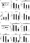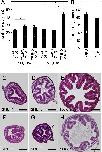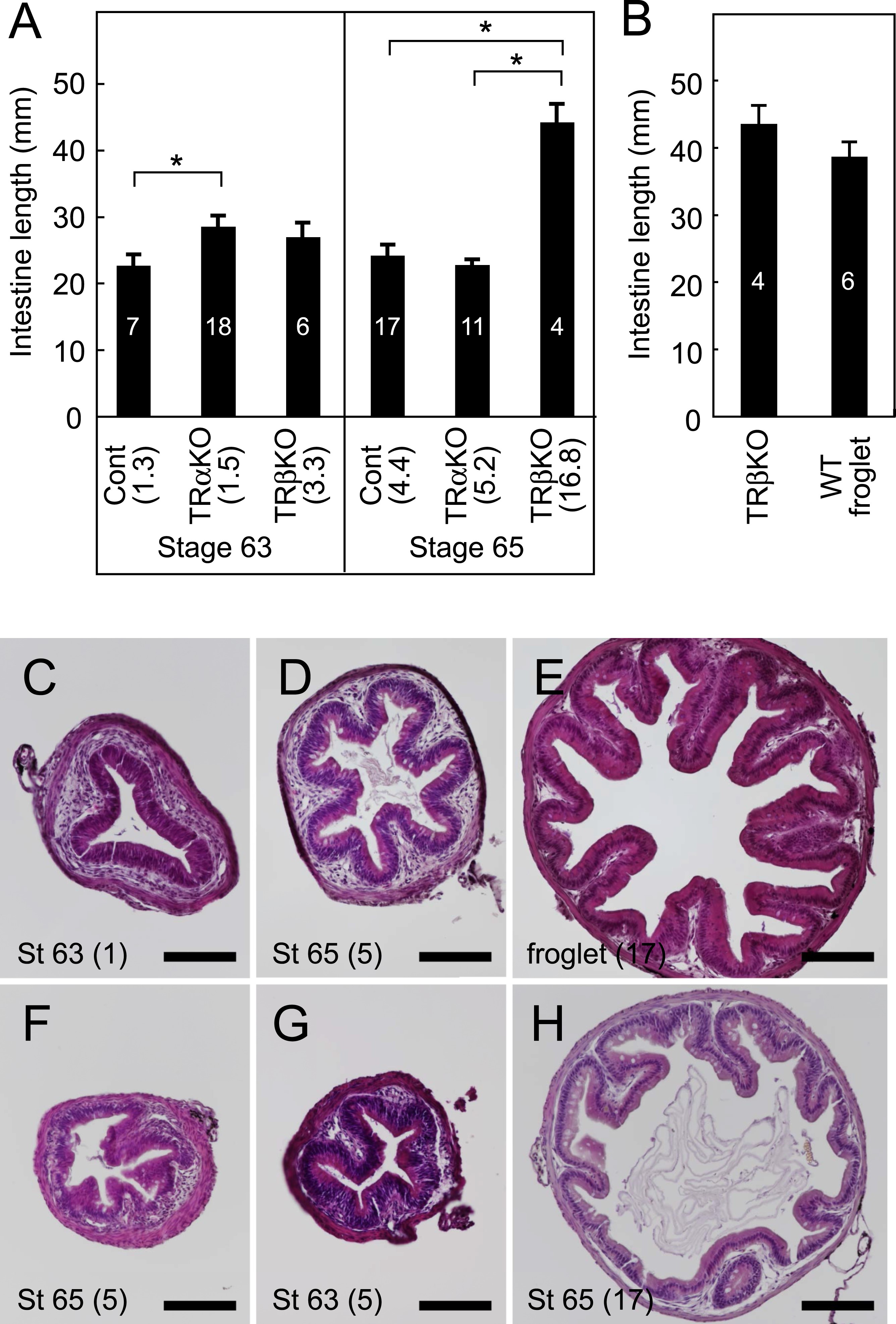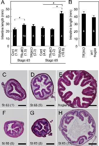 Figure 7. Effect of TRα and TRβ knockout on intestinal remodeling. (A) Comparison of the intestinal lengths of wild-type, TRα-knockout, and TRβ-knockout stage-63 and stage-65 tadpoles. Data are expressed as mean ± SE. Sample number is indicated in each column. Significant differences between the indicated groups were determined by performing a Bonferroni test. *P < 0.05. (B) Comparison of the intestinal lengths of the TRβ-knockout stage-65 tadpoles and wild-type froglets 14 to 17 and 15 to 18 days after stage 62, respectively. Data are expressed as mean ± SE. Sample number is indicated in each column. There was no significant difference based on a Student t test. (C–H) Cross sections of the intestine at the indicated stages. Intestinal fragments were cut 6 to 9 mm from the pylorus at the anterior part of the small intestine. Images are representative of three individuals examined per panel. (C–E) Wild-type (C) stage-63 and (D) stage-65 tadpoles and (E) froglets. (F) TRα-knockout stage-65 tadpole. (G and H) TRβ-knockout (G) stage-63 and (H) stage-65 tadpoles. Sections were stained with hematoxylin and eosin. The number of days from stage 62 are shown in parentheses. Scale bars, 0.1 mm. Image from "Thyroid Hormone Receptor α– and β–Knockout Xenopus tropicalis Tadpoles Reveal Subtype-Specific Roles During Development ." Keisuke Nakajima, Ichiro Tazawa, Yoshio Yaoita Endocrinology, Volume 159, Issue 2, February 2018, Pages 733–743, https://doi.org/10.1210/en.2017-00601. Reprinted with permission from AAAS. |