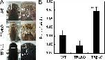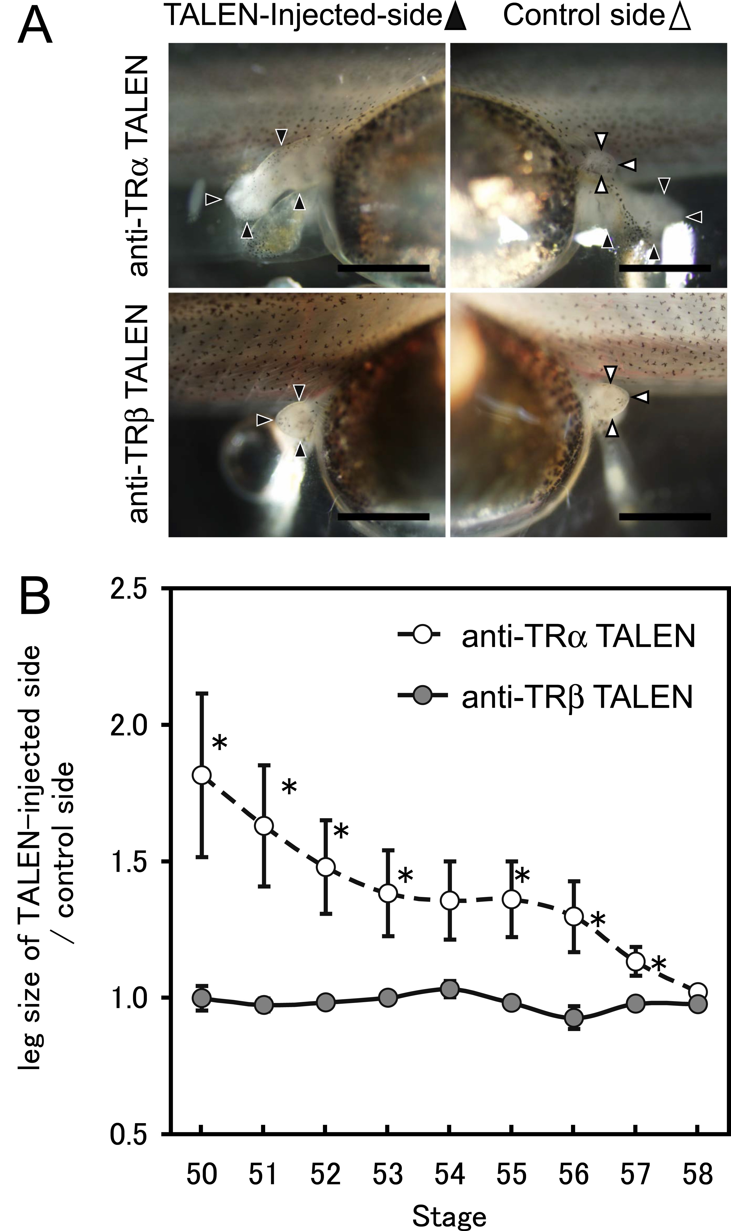 Figure 2. Effect of TR and TR ablation on hind limb development. A total of 200 pg of TALEN-ELD/KKR mRNA mixture was injected into one side of two- or four-cell embryos with mCherry mRNA to modify TR or TR. Embryos that expressed mCherry on the left side or right side were separated under a fluorescence dissecting microscope and reared individually. Developmental stages 50 to 58 were determined based on the hind limb development of the control side. Stage was recorded every day. (A) Lateral view of the hind limb on the TALEN-ELD/KKR mRNA-injected (black arrowheads) and control (white arrowheads) sides. Scale bars, 1 mm. (B) The ratio of the length of the hind limb on the TALEN-ELD/KKR mRNA-injected side to that on the control side was calculated. Data are expressed as mean SE [n = 9 (TR) or 4 (TR)]. Significant differences between TR (open circle)- and TR (gray circle)-modified tadpoles were determined by performing a Student t test. *P < 0.05.