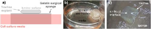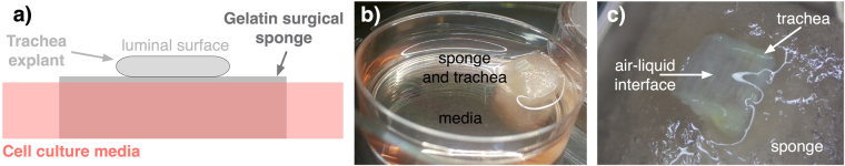 Ex vivo tracheal explant culture. (a) Schematic of culture setup. (b) Photograph of petri dish housing a gelatin sponge upon which a trachea is placed. (c) Close-up photograph of trachea on gelatin sponge.