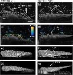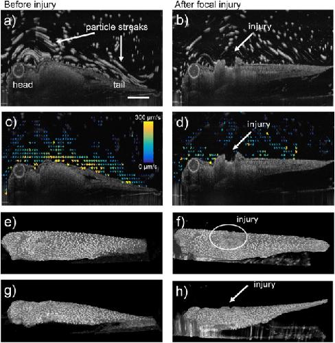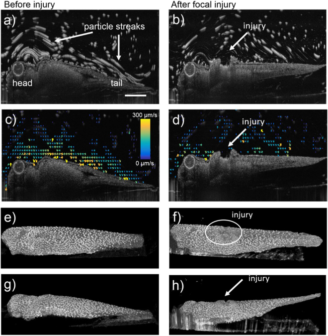 Figure 2. Imaging of ciliated Xenopus embryo skin before (a,c,e,g) and after focal injury (b,d,f,h). (a,b) Maximum intensity projection of a 100-frame video allows the visualization of tracer particles as particle streaks. The injury is visible as indentation in the embryos surface (marked with an arrow in b). (c,d) Vector flow field quantification of cilia-driven flow. The vector flow field is disrupted around location of injury (panel d). (e–h) 3D rendered speckle variance images visualize beating ciliary patches on embryo surface (panels e and f- view from top; panels g and h- view from side). The injury is visible as area with low speckle variance (white circle) in panel f and as indentation in panel h. The scale bar in panel a measures 0.5 mm.