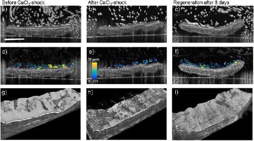 Figure 5. OCT Imaging of mouse trachea before (a,d,g), after CaCl2-shock (b,e,h) and after regeneration 8 days later (c,f,i). (a–c) Maximum intensity projection of a 200-frame video allows the visualization of flowing tracer particles as particle streaks. After application of CaCl2 flow is disrupted along the whole epithelium and tracer particles appear stationary. Flow is restored after 8 days of ex vivo culture. (d–f) Vector flow field of cilia-driven flow, gained by PTV analysis. The vector flow field shows very small and undirected movement of tracer beads after application of CaCl2 and complete restoration after regeneration. (g–i) 3D rendered speckle variance images visualize beating cilia as area of high image intensity. After CaCl2-induced loss of beating cilia, the surface appears spotted with an increase of low variance area h). After cilia restore, the surface appears smooth with high speckle variance again i). The scale bar in a) measures 0.5 mm.