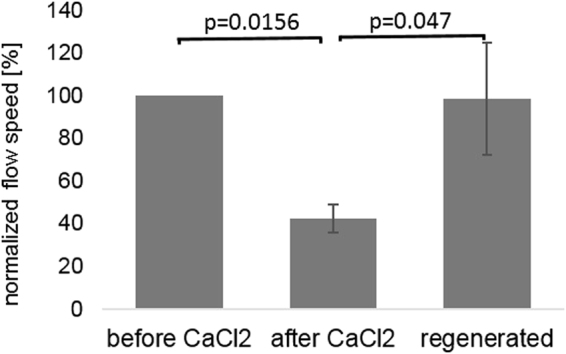 Figure 4. (a) PTV-OCT results before and after application of CaCl2 to 6 Xenopus embryos. T1-T6 describes each individual animal. (b) Percentage decrease in flow speed after CaCl2 application. Error bars depict standard error. Wilcoxon signed rank test shows a significant decrease in flow speed (p = 0.03).