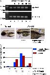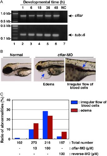 Fig. 7. Developmental anomalies in zebrafish embryos with knockdown of cflar transcripts. (A) The expression profile of zebrafish cflar transcripts during embryogenesis. Total RNAs isolated from embryos, which were collected at 1, 6, 18, 36, and 48 h after fertilization (lanes 2–6), was analyzed by RT-PCR. PCR products amplified with primers specific for cflar (upper panel) and tubulin α6 (tubα6) (lower panel) were resolved by agarose-gel electrophoresis. Molecular weight markers were run in lane 1, and a negative control (NC) with no template DNA was run in lane 7. Arrows indicate the expected positions of the cflar and tubα6 PCR products, respectively. (B) Morphological analysis of developing embryos subjected to morpholino oligonucleotide (MO) injection. Fertilized eggs were injected with an antisense MO for cflar, cflar-MO and their development was monitored under the microscope. Images of the developing embryos were acquired at three days later. The resulting abnormal phenotypes consisted of edema (middle panel) and a cluster of blood cells in the vessel (right panel), indicated by an arrow. (C) A summary of the phenotypic data presented in (B). Embryos displaying the edema (red) or irregular flow of red blood cells (blue) were counted under the microscope. Data represent the percentages calculated from four independent experiments. |