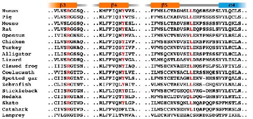 Fig. A1. Multiple alignment of partial amino acid sequences in the CASc* domain of c-FLIP proteins. The conserved arginine (R), tyrosine (Y), and leucine (L) residues are shown in red. The assignments of α-helix and β-sheet secondary structure elements are based on a previous report (see Ref. [30]). |
