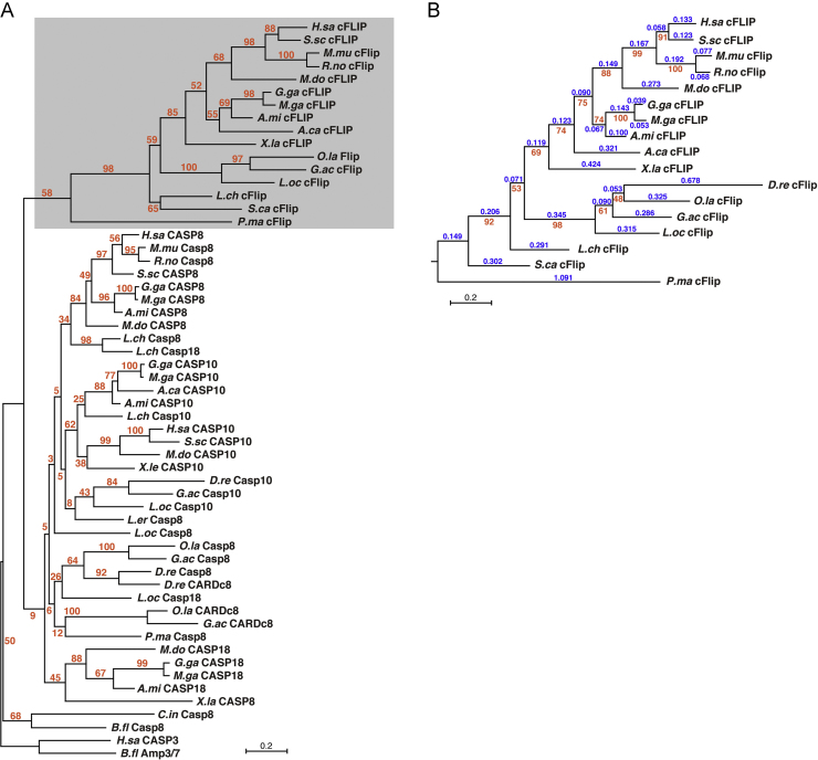 Fig. 2. Molecular phylogenetic analysis of c-FLIP and its paralogous proteins. (A) A molecular phylogenetic tree of c-FLIP and its paralogs, CASP8, CASP10, CASP18, and CARD-casp8 was constructed by RAxML, based on an alignment of the protease-like/protease (CASc*/CASc) domains (145 amino acid sites without mismatches including insertion/deletion (indel)). Human CASP3 and amphioxus CASP3-like AmphiCASP3/7 proteins were used as an out-group for rooting the tree. Numbers (in orange) at internal branches indicate the percentage of support of that branching pattern based on a bootstrap method with 100 replicates (bootstrap probabilities). The scale bar indicates the evolutionary distance of 0.2 amino acid substitutions per site. (B) A molecular phylogenetic tree restricted to the c-FLIP subfamily proteins. The tree was constructed by RAxML, based on an alignment of the c-FLIP CASc* domains (164 amino acid sites) derived from 17 animal species including zebrafish. The number (in blue) above each branch shows branch length, while the number (in orange) beneath each internal branch shows bootstrap probability. The scale bar indicates the evolutionary distance of 0.2 amino acid substitutions per site. The identification numbers of the c-FLIP subfamily and its paralogous proteins shown in the tree are listed in Table A1. Abbreviations of the species: A.ca, A. carolinensis (anole lizard); A.mi, A. mississippiensis (alligator); B.fl, B. floridae (lancelet); D.re, D. rerio (zebrafish); G.ac, G. aculeatus (stickleback); G.ga, G. gallus (chicken); H.sa, H. sapiens (human); L.ch, L. chalumnae (coelacanth); L.er, L. erinacea (little skate); L.oc, L. oculatus (spotted gar); M.do, M. domestica (opossum); M.ga, M. gallopavo (turkey); M.mu, M. musculus (mouse); O.la, O. latipes (medaka); R.no, R. norvegicus (rat); S.ca, S. canicula (catshark); S.sc, S. scrofa (pig); X.la, X. laevis (African clawed frog) |