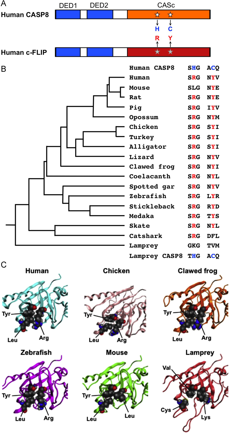 Fig. 3. The specified amino acid substitutions of the CASc⁎ domain and their evolutionary conservation. (A) A schematic diagram of human CASP8 and c-FLIP proteins. Two DED motifs, a CASc protease domain, and a CASc* protease-like domain are indicated by boxes, respectively. White stars indicate the position of the essential amino acid residues, histidine (H) and cysteine (C) for the catalytic dyad formation in CASP8, whereas the gray stars indicate arginine (R) and tyrosine (Y) of c-FLIP positionally corresponding to two amino acid residues of CASP8, and are also coincident with positions (1) and (2), as shown in Fig. 1A. (B) A summary of critical amino acid residues of c-FLIP proteins conserved in vertebrates. Both the arginine (R) and tyrosine (Y) residues are evolutionarily conserved in most bony vertebrates. In the mouse c-Flip protein, the arginine residue is exceptionally changed to leucine. In the fish lineage, a phenylalanine (F) residue instead of tyrosine is present in the catshark whereas both lysine (K) and valine (V) residues are present at these two critical positions in the lamprey. A taxonomic tree of the species shown at the left was generated based on the previous study [70]. (C) Closeup views of the pseudocatalytic triad of c-FLIP proteins. The arginine, tyrosine, and leucine residues, which are shown in spheres, in human, chicken, clawed frog, and zebrafish c-FLIP proteins are brought close together in the three-dimensional shape forming a triad. In the lamprey, c-FLIP includes lysine, valine, and cysteine residues instead of the conserved amino acids, resulting in the failure of the triad formation. As mouse c-FLIP has replaced the arginine residue with leucine (L), there is little interaction with another leucine. The gray, red, and blue spheres indicate C, O, and N atoms, respectively. |
