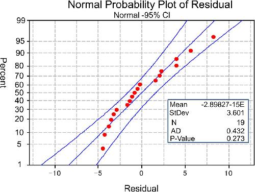 Normal probability plot for the residual of the regression analysis of the fast-start swimming speed. All points of the normal plot for the residual were within a 95% confidence interval (CI, confidence interval; N, the number of residuals; AD, Anderson-Darling statistic; St Dev, standard deviation of residuals).