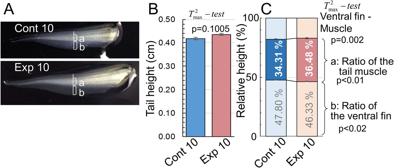 Measurements of tail height, tail muscle and height of the ventral fin. (A) Photographs of tadpoles in the control (Cont 10) and experimental group (Exp 10). Lines indicate tail height, and the lowercase letters a and b indicate height of the tail muscle and height of the ventral fin, respectively. Tail height (B), height of the tail muscle, and height of the ventral fin (C) were measured in 50 tadpoles from each group of tadpoles exposed to predation for 10 days (Exp 10) and the control (Cont 10). These values were obtained at the points of the greatest height of tadpole's tail from images of tadpoles using ImageJ software.