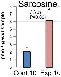 Analysis of sarcosine using GC-MS. Tails from nine different Xenopus tadpoles were randomly selected from the group of tadpoles exposed to predation for 10 days (Exp 10) and the control group (Cont 10), and three tails were combined to prepare three samples for each experiment. Sarcosine was extracted and the content was expressed as picomol of sarcosine per gram of wet sample. Statistical analysis was performed using a two-sample t-test.