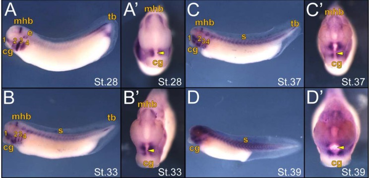 Embryos are shown in a lateral (A-D) or anterior (Aâ-Dâ) view with the cement gland (cg) labeled for ventral orientation. (A) Stage 28 embryo showing strong expression in the branchial arches (ba), midbrain-hindbrain boundary (mhb), ear placode (e), and tailbud (tb) with the yellow arrowheads marking the primitive mouth. (B) Stage 33 embryos showing decreased expression in the branchial arches (ba), midbrain-hindbrain boundary (mhb) and tailbud (tb), with concentrated expression surrounding the primitive mouth (arrowhead) and expression in the somites (s). (C-D) Stage 37 and 39 embryos showing continued concentrated ism1 expression surrounding the primitive mouth (arrowhead).
