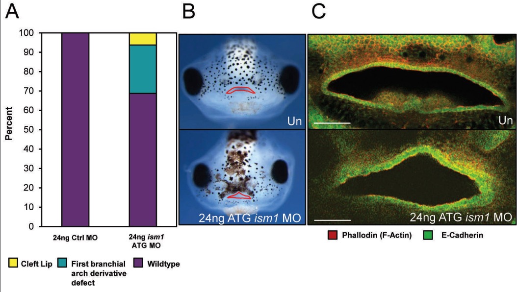 Figure 6: Morpholino knockdown of ism1 in Xenopus laevis embryos results in clefting phenotypes. (A) Quantification of embryos injected with 24ng control morpholino (Ctrl MO) versus 24ng ism1 translation-blocking (ATG) MO shows craniofacial anomalies and clefting phenotypes in the ism1-altered group. (B) Faces of stage 43 embryos which are uninjected (top) or injected with 24ng ism1 ATG MO and exhibiting a cleft (bottom). Mouths have been outlined in red. (C) Phalloidin (red) and E-cadherin (green) staining to detect cell boundaries and epithelial cells, respectively, of the mouth of an uninjected (top) or 24ng ism1 ATG MO injected