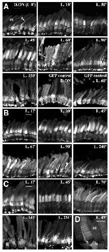 were dark-adapted overnight and either fixed at time ¼ 0 (D.ON), or fixed following light-adaptation for t ¼ 15; 30, 45, 60, 90, or 150 min. Lower right-hand two