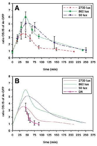 Ar-GFP that were dark-adapted overnight and light adapted for t ¼ 17; 30, 45, 67, 90, or 240 min. (C) Light adaptation at 25â50 lux. Green fluorescent confocal
