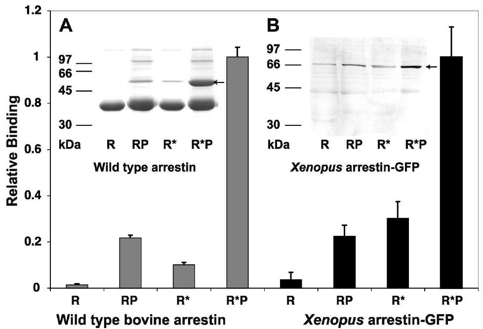 indicates arrestin (the band migrating below the 45 kDa marker is rhodopsin). (B) Western blot of SDSâPAGE gel of Xenopus Ar-GFP bound to bullfrog