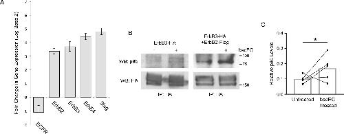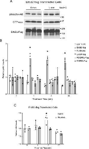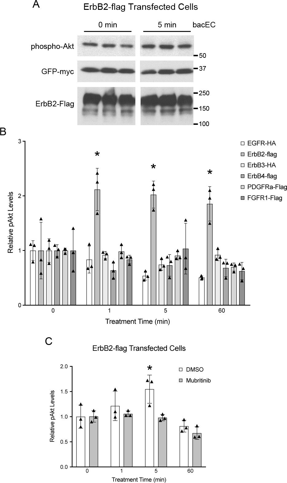 Fig 4. Recombinant EC1-3 (bacEC) increases Akt phosphorylation in ErbB2-transfected cells. Hek293T cells were transfected with receptor tyrosine kinases, serum-starved and treated with bacEC for indicated lengths of time. Lysates were probed for phospho-Akt (pAkt) and GFP-myc. The latter was co-transfected with receptor constructs to account for variation in transfection efficiency that could result in changes to receptor protein levels. (A) Representative western blot of lysates from ErbB2-transfected cells (in triplicate). (B,C) Quantification of pAkt from cell lysates. GFP-myc was used for normalization. (B) ErbB2-expressing cells had significantly higher pAkt levels after exposure to bacEC (p = 0.018â0.036). The p values are p = 0.02, p = 0.018 and p = 0.036 for the 1, 5, and 60 minute time points. (C) Addition of 600 nM mubritinib to ErbB2-transfected cells abrogated the effect bacEC on Akt phosphorylation. Results are representative of three independent experiments. Means were calculated from triplicates and shown as bars. Data points are shown as stars. One-tailed, Studentâs t-tests were performed to determine statistical significance. * p<0.05. https://doi.org/10.1371/journal.pone.0188963.g004 |