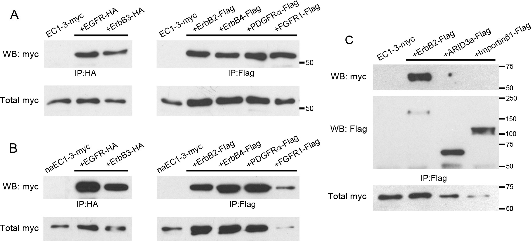 Fig 3. EC1-3-myc and non-adhesive EC1-3-myc interact with growth factor receptors. Western blots of EC1-3-myc (A) and non-adhesive EC1-3-myc (B; naEC1-3-myc) co-immunoprecipitations (coIPs). Receptors were immunoprecipitated using anti-HA or anti-flag antibodies. Both EC1-3 constructs co-IPed with all receptors: HA-tagged EGFR/ErbB1, HA-tagged ErbB3 and flag-tagged ErbB2, ErbB4, PDGFRα and FGFR1. (C) Western blot of EC1-3-myc coIP with cytosolic proteins ARID3a-flag and importinβ1-flag. To test if EC1-3 could interact non-specifically with proteins following extraction we tested Flag-tagged constructs overexpressed in Hek293T cells. EC1-3-myc did not associate with ARID3a-flag, nor importinβ1-flag. ErbB2-flag was used as a positive control. Results are representative of three independent experiments. https://doi.org/10.1371/journal.pone.0188963.g003 |