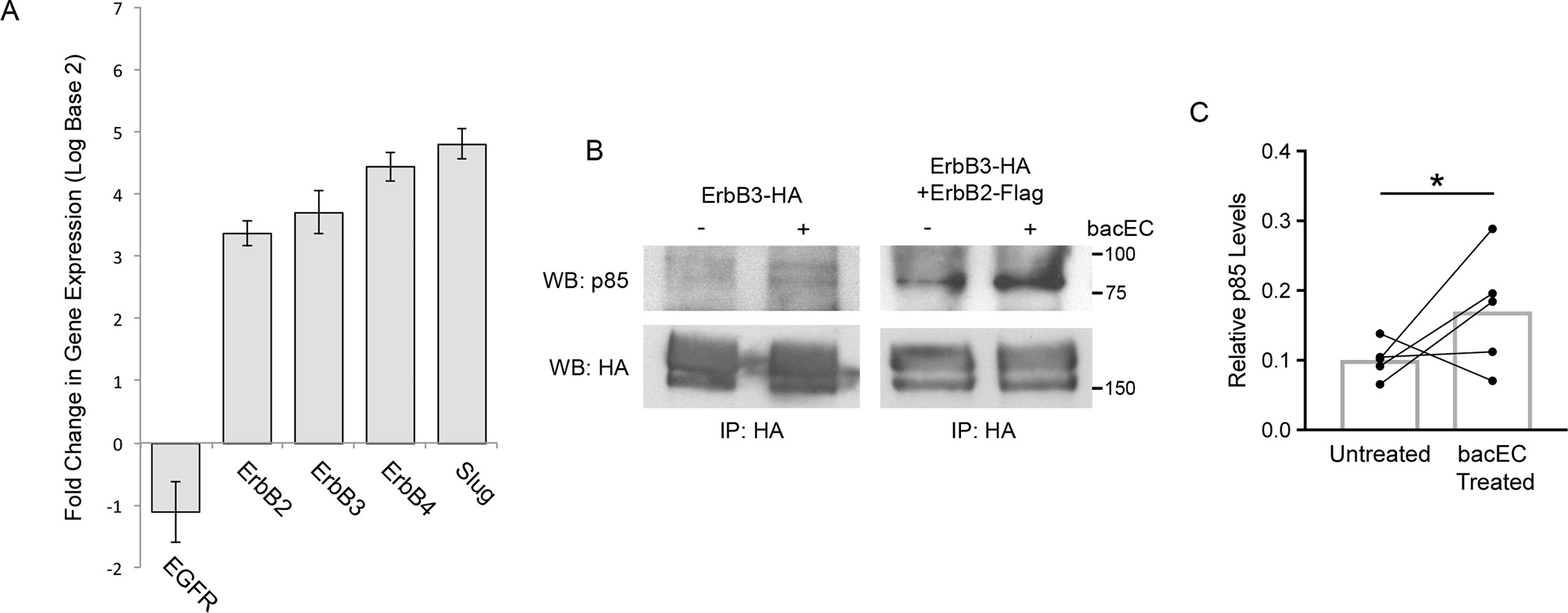 Fig 5. ErbB2-ErbB3 heterodimers bind PI3K p85 in the presence of recombinant EC1-3 (bacEC). (A) Quantitative real-time PCR analysis of ErbB receptors from dissected CNC and stage 16 embryos. The relative gene expression in the CNC is compared to that of whole embryos at the same stage. ErbB2, 3, and 4 are enriched in the CNC compared to whole embryos. Slug was used as a positive control for CNC enrichment. GAPDH was used for normalization. (B) Western blot of co-immunoprecipitation experiments with ErbB3-HA and p85 in the presence or absence of bacEC and ErbB2-flag. Hek293T cells were transfected with ErbB3-HA alone or together with ErbB2-flag, serum starved, and treated with 10 ng/mL bacEC for 5 minutes before being lysed for co-immunoprecipitation experiments. ErbB3-HA modestly binds p85 when transfected alone. Co-transfection of ErbB3-HA with ErbB2-flag noticeably increases this interaction. Association of p85 with ErbB3-HA is further elevated in the presence of bacEC. (C) Co-precipitation of p85 with ErbB3-HA and ErbB2-flag significantly increases (p = 0.03) in the presence of bacEC. Immunoprecipitated ErbB3-HA was used for normalization. Results are representative of three independent experiments. https://doi.org/10.1371/journal.pone.0188963.g005 |