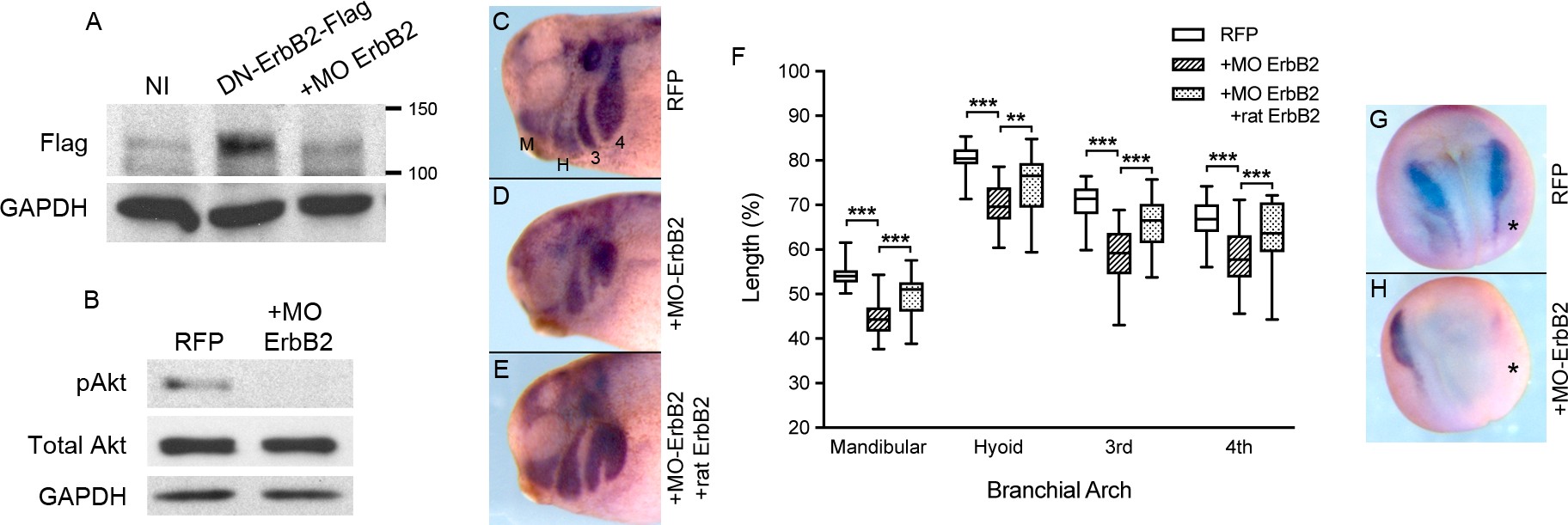 Fig 6. Knockdown of ErbB2 decreases phosphorylation of Akt and CNC migration. (A) Western blot of non-injected (NI) and injected embryo extracts probed for flag. Single-cell embryos were injected with 800 pg DN-ErbB2-Flag mRNA with or without 25 ng of ErbB2 morpholino (MO ErbB2). Translation of DN-ErbB2-flag was hindered in embryos co-injected with MO ErbB2. GAPDH is shown as a loading control. One-embryo equivalents are loaded per lane. (B) Western blot of CNC extracts probed for phospho-Akt, total Akt and GAPDH. Eight-cell embryos were either injected with 200 pg RFP mRNA alone (N = 4, n = 32) or with 3.1 ng MO Erb2 (N = 3, n = 43) into CNC progenitor cells. CNC cells were then dissected from embryos once they reached stage 17â18. Injection of MO ErbB2 into CNC cells precursors dramatically reduced phosphorylation of Akt without altering the levels of control proteins. Ten CNC explants are loaded in each lane. (C-E) Early tailbud stage embryos labeled for Twist and Sox10 CNC markers using in situ hybridization. Embryos were injected as in part (B) along with a set injected with 300 pg rat ErbB2-flag and 1.6 ng MO ErbB2 (E; N = 2, n = 20). Embryos injected with RFP mRNA and MO ErbB2 showed defects in CNC migration (D) compared to RFP-injected controls (C). Migration was partially rescued by co-injecting the morpholino with rat ErbB2-flag mRNA (E). (F) CNC migration was measured in each branchial arch and normalized to head size from embryos in part (C-E). Co-injection of MO ErbB2 with RFP mRNA significantly reduced CNC migration in the mandibular (M), hyoid (H), 3rd and 4th branchial arches. Co-injection of MO ErbB2 with rat ErbB2 mRNA partially rescued migration. Error bars are one standard deviation to the mean. One-tailed, Studentâs t-tests were performed to determine statistical significance. ** p<0.01, *** p<0.001. N, number of experiments; n, number of embryos. https://doi.org/10.1371/journal.pone.0188963.g006 |